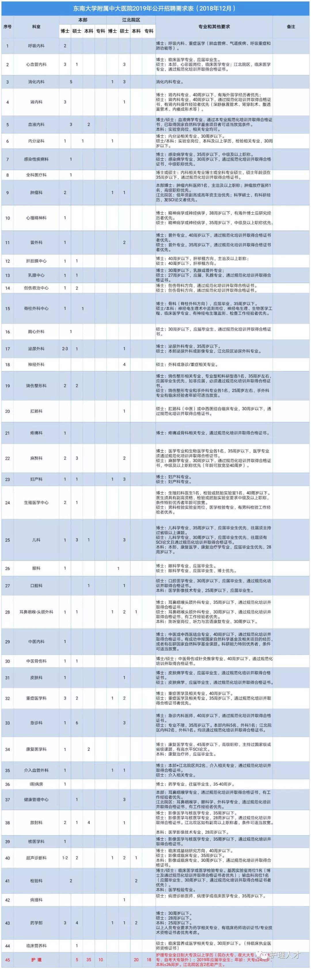 临床、医技、护理、管理等岗位,详情见附件《东南大学附属中大医院2019年公开招聘岗位一览表》。