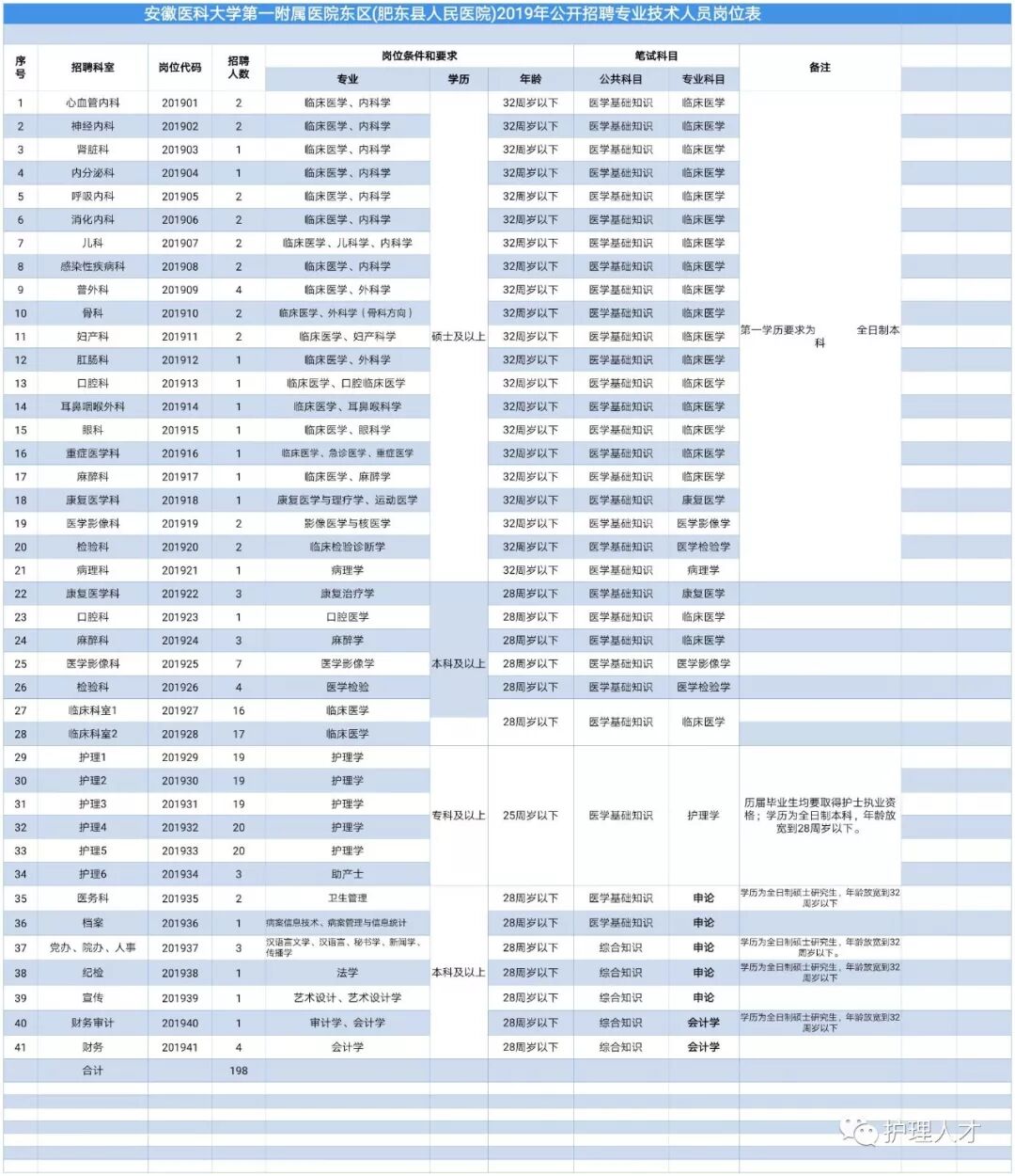 本次计划招聘专业技术人员198名。具体岗位见《安徽医科大学第一附属医院东区(肥东县人民医院)2019年公开招聘专业技术人员岗位表》。