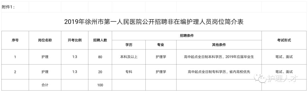 面向社会公开招聘100名护理人员,学历要求为高中起点全日制普通高校学历。详见附件1:《徐州市第一人民医院2019年公开招聘非在编护理人员岗位表》。