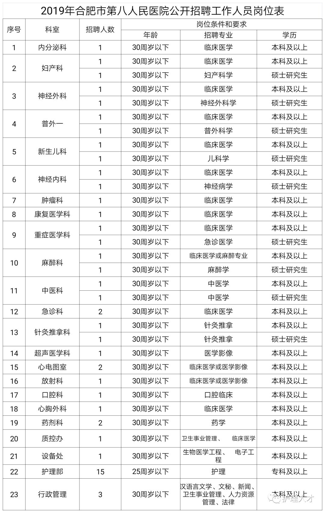 附:2019年合肥八院公开招聘工作人员岗位表