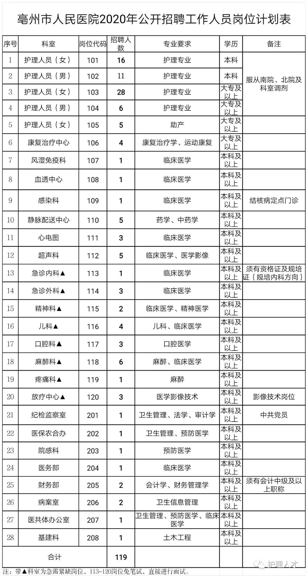 计划招聘119名,各岗位具体招聘人数和条件见《亳州市人民医院2020年公开招聘工作人员岗位计划表》。
