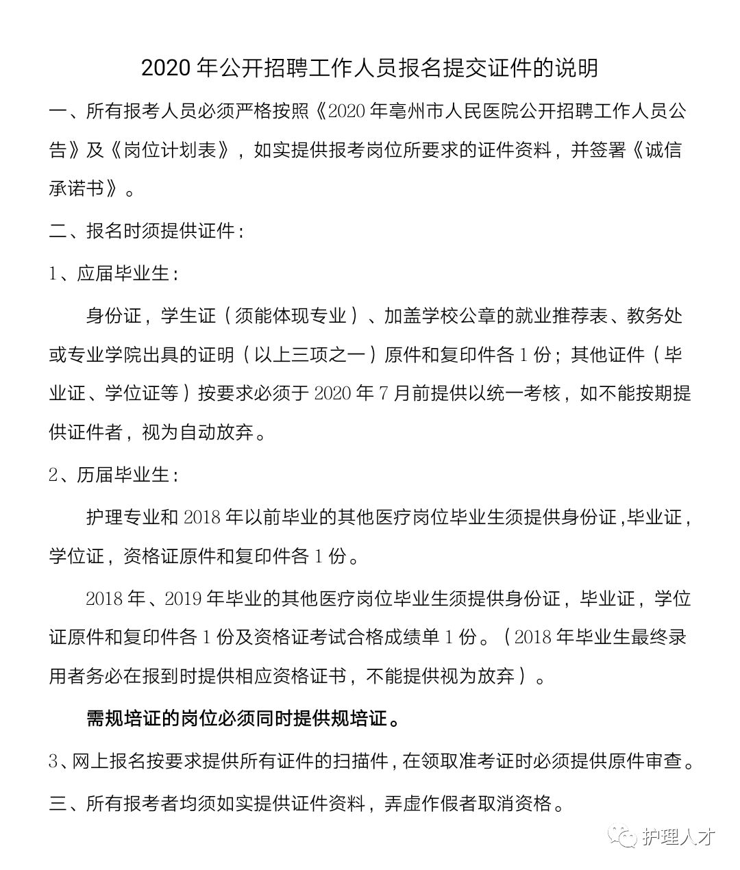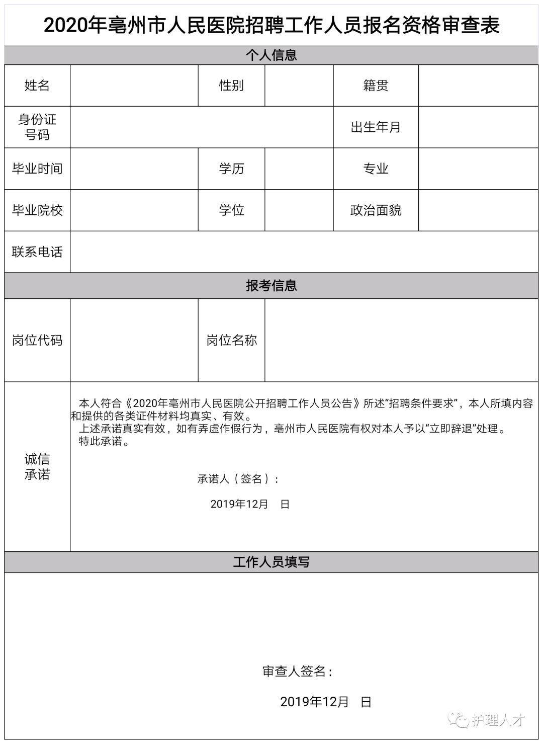 2.报考人员阅知并签署《诚信承诺书》,按要求如实、正确填写《2020年亳州市人民医院公开招聘工作人员报名资格审查表》。所填信息必须与本人实际情况、报考资格条件和所报考岗位的资格条件要求一致、真实无误,并提供有效的通讯方式。